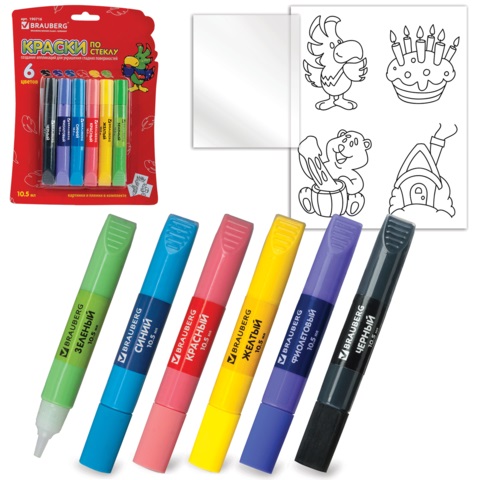 Краски витражные BRAUBERG 6 цветов 10,5 мл+1 пленка+4 шаблона