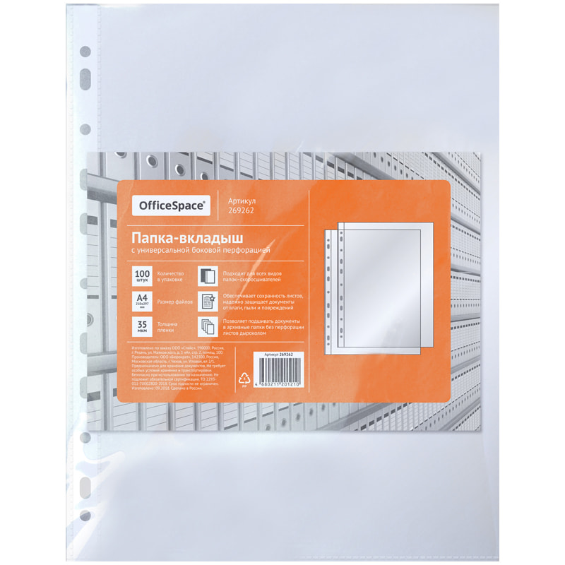 Файлы А4 100 штук, 35 мкм OffoceSpace, перфорация, глянцевые 269262
