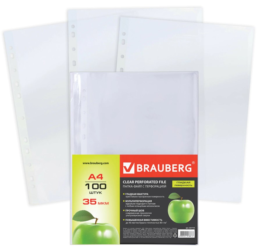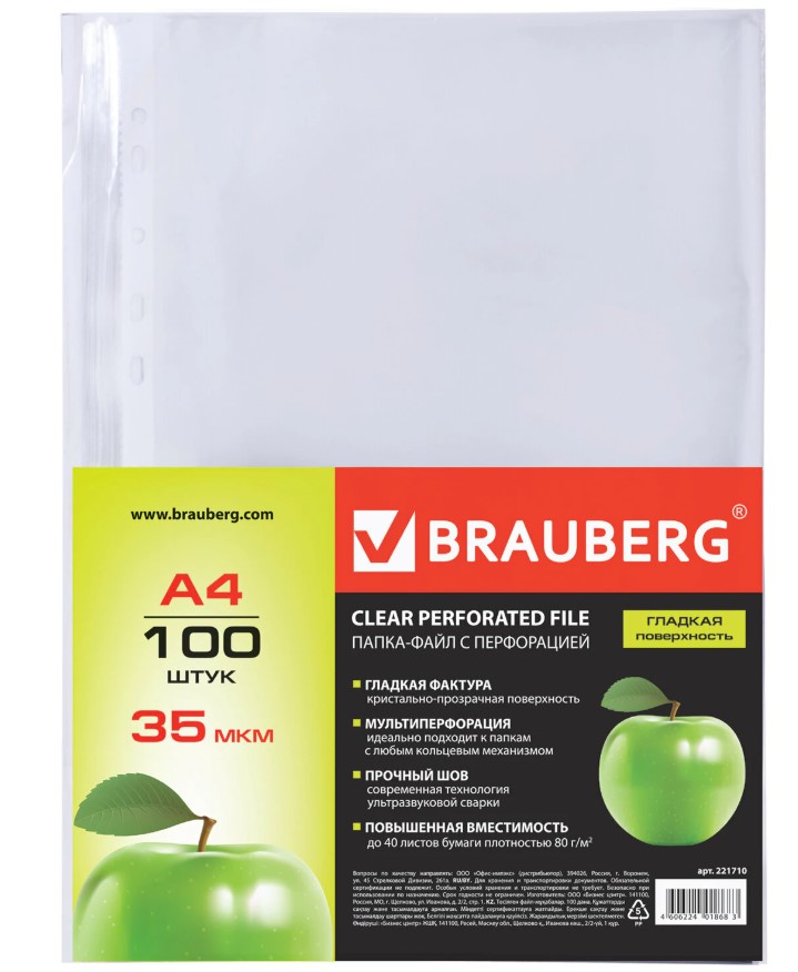 Файлы перфорированные, А4, комплект 100 штук, Brauberg "Яблоко" гладкие, 0,035 мм