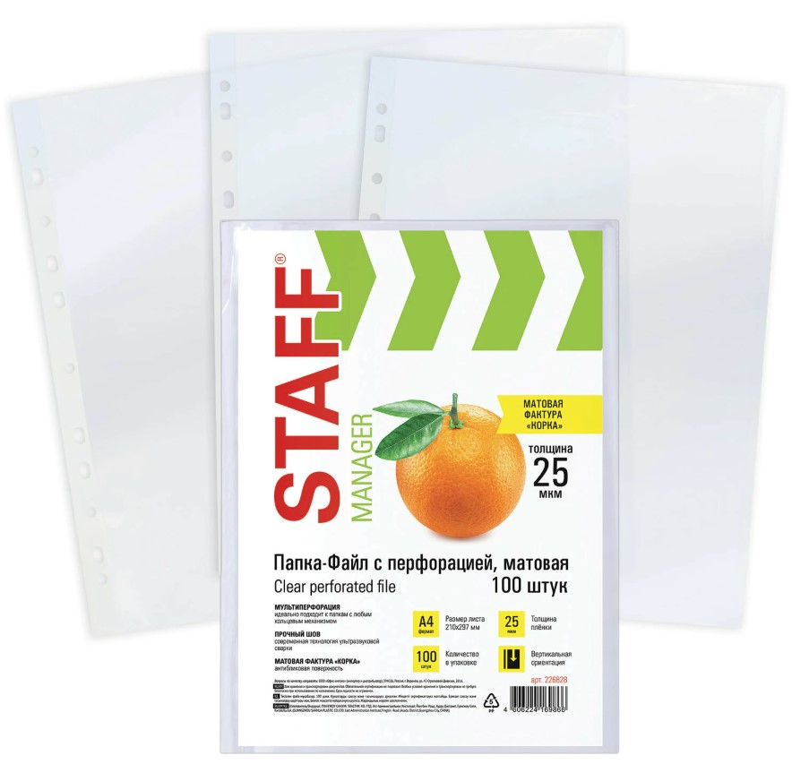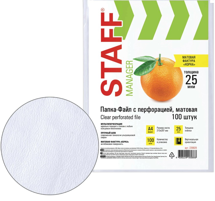 Файлы А4, 100 штук, 25 мкм с перфорацией STAFF "Апельсиновая корка"
