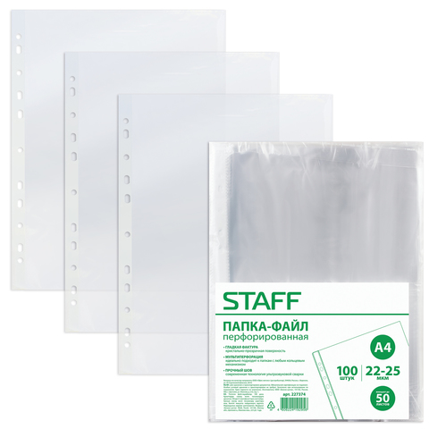 Бюджетная папка-файл перфорированная STAFF подходит для подшивки документов в папки с любым кольцевым механизмом и скоросшивателем.