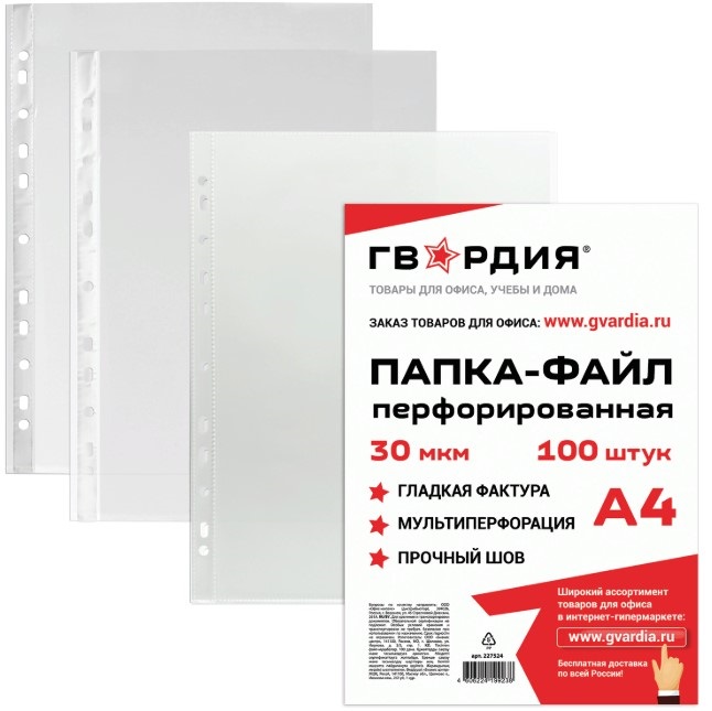 Файлы А4 100 штук 30 мкм гладкие "Гвардия" с перфорацией