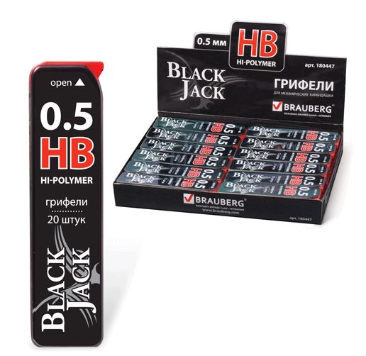 Грифели для механических карандашей чернографитные HB 0,5 мм, 20 штук, Brauberg "Black Jack" Hi-Polymer