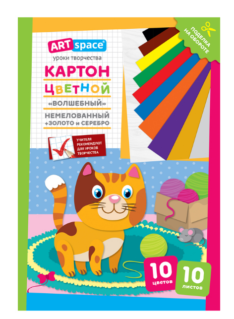 Картон цветной А4, 10 цветов, 10 листов, ArtSpace "Котенок" волшебный, немелованный, (золото, серебро), в папке 290868