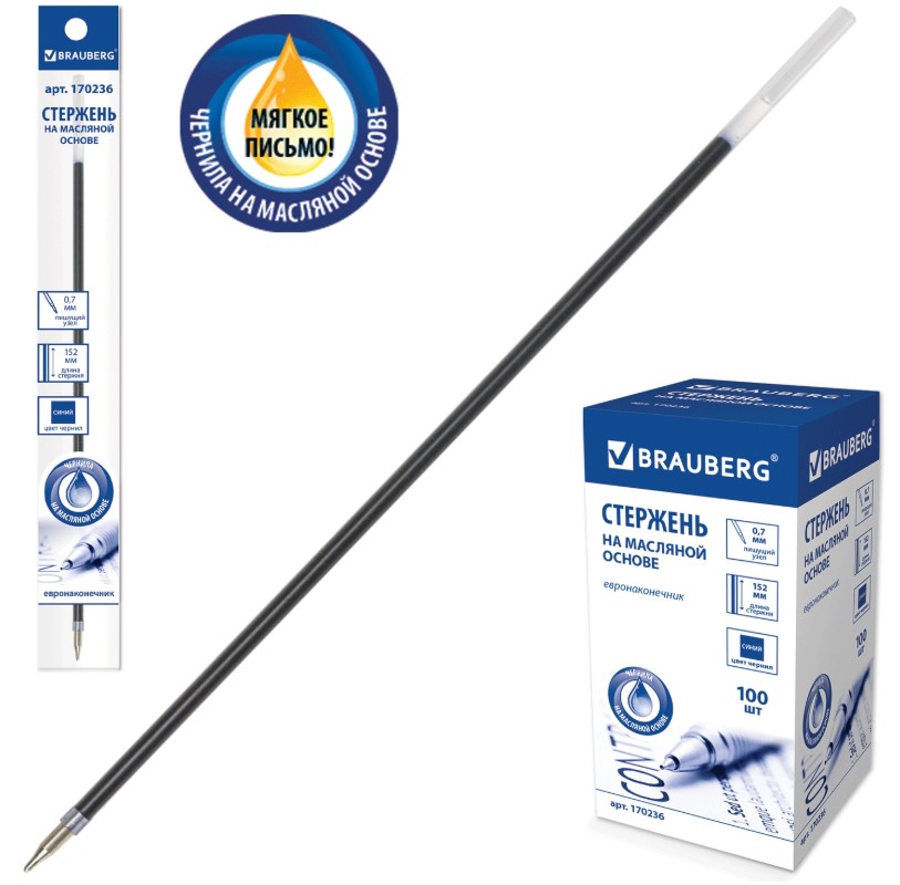Стержень шариковый 0,7 мм, синий Brauberg 20 штук 152 мм, евронаконечник 170236