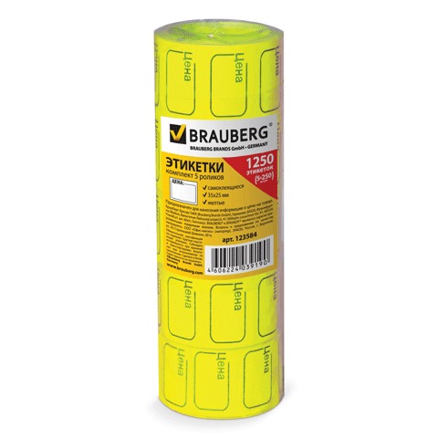 Ценник цветной 35*25 мм BRAUBERG, 5 рулонов по 250 штук, жёлтые