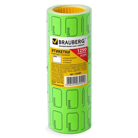 Ценник цветной 35*25 мм BRAUBERG, 5 рулонов по 250 штук, зелёные