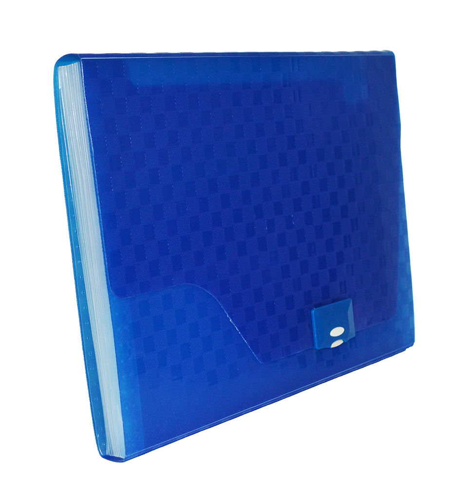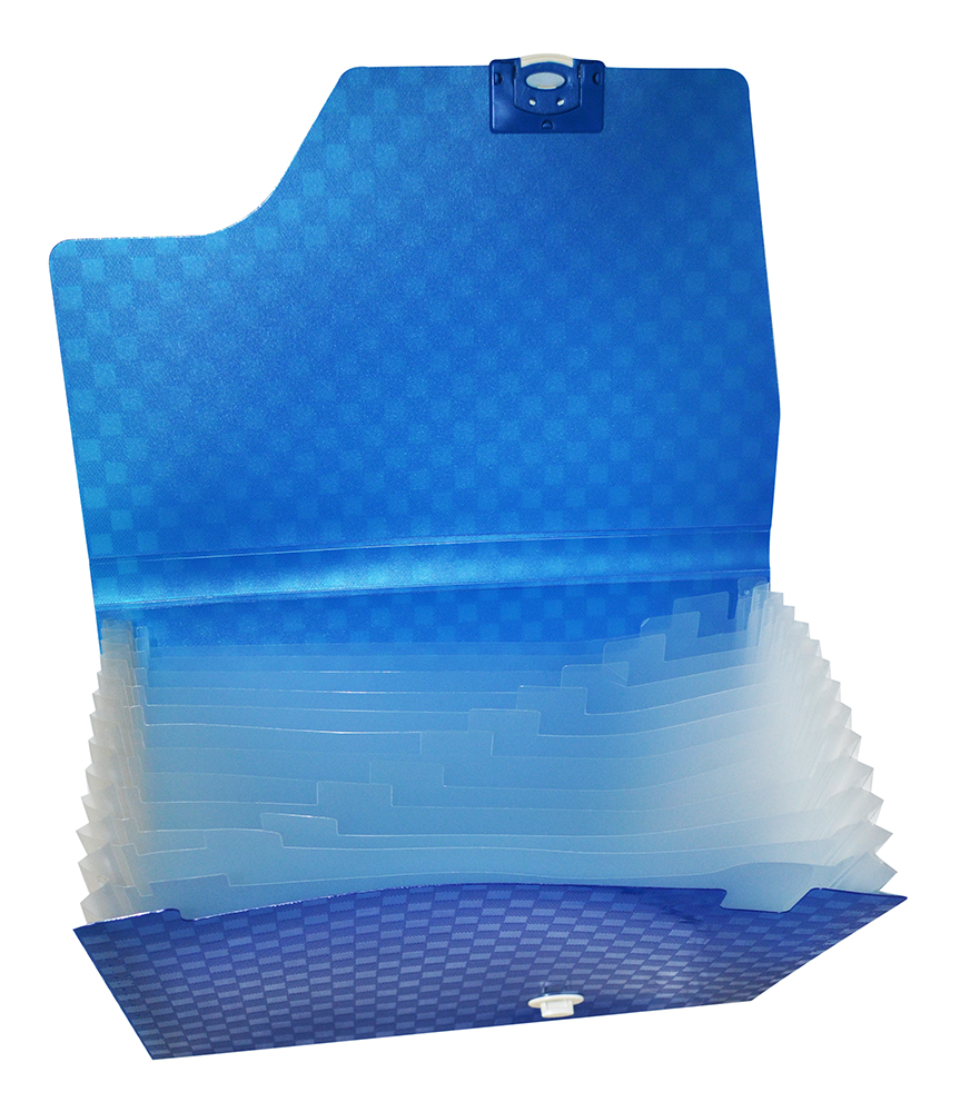 Портфель формата А4 из плотного полупрозрачного рельефного пластика с узором в клетку для хранения файлов и документов. В портфеле 13 полупрозрачных карманов с "язачками" для маркировки, в комплект входят наклейи с английским алфавитом. Портфель плотно закрывается на пластиковый замок. Удобен для переноски документов, предотвращает их смятие и загрязнение.