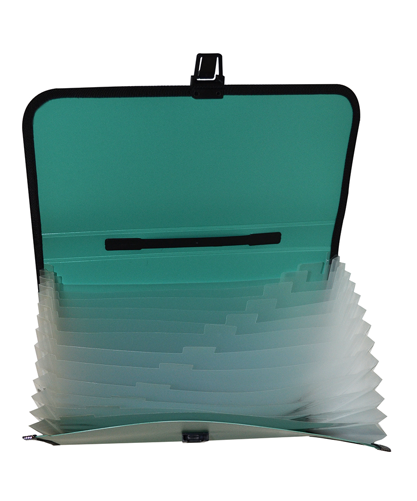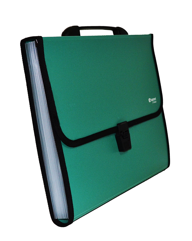 Портфель формата А4 из плотного непрозрачного пластика с тесемочной окантовкой и ручкой для хранения файлов и документов. В портфеле 13 полупрозрачных карманов с "язачками" для маркировки, в комплект входят наклейи с цифрами. Портфель плотно закрывается на замок. Удобен для переноски документов, предотвращает их смятие и загрязнение.