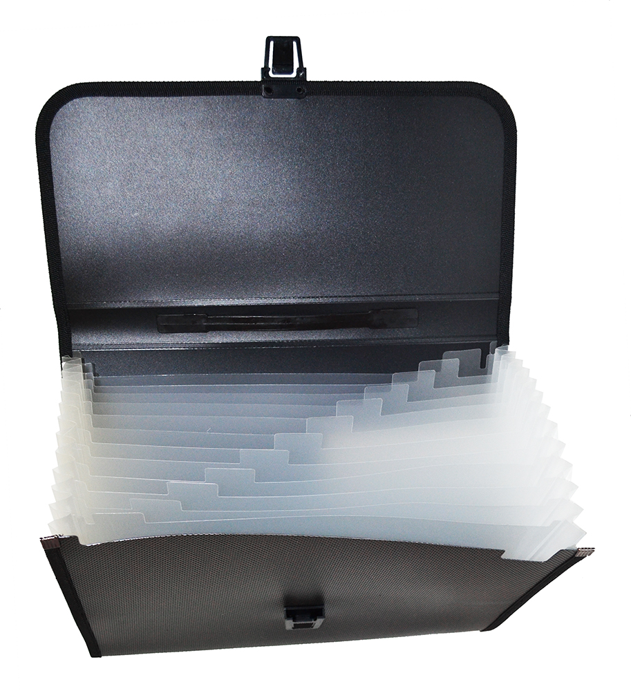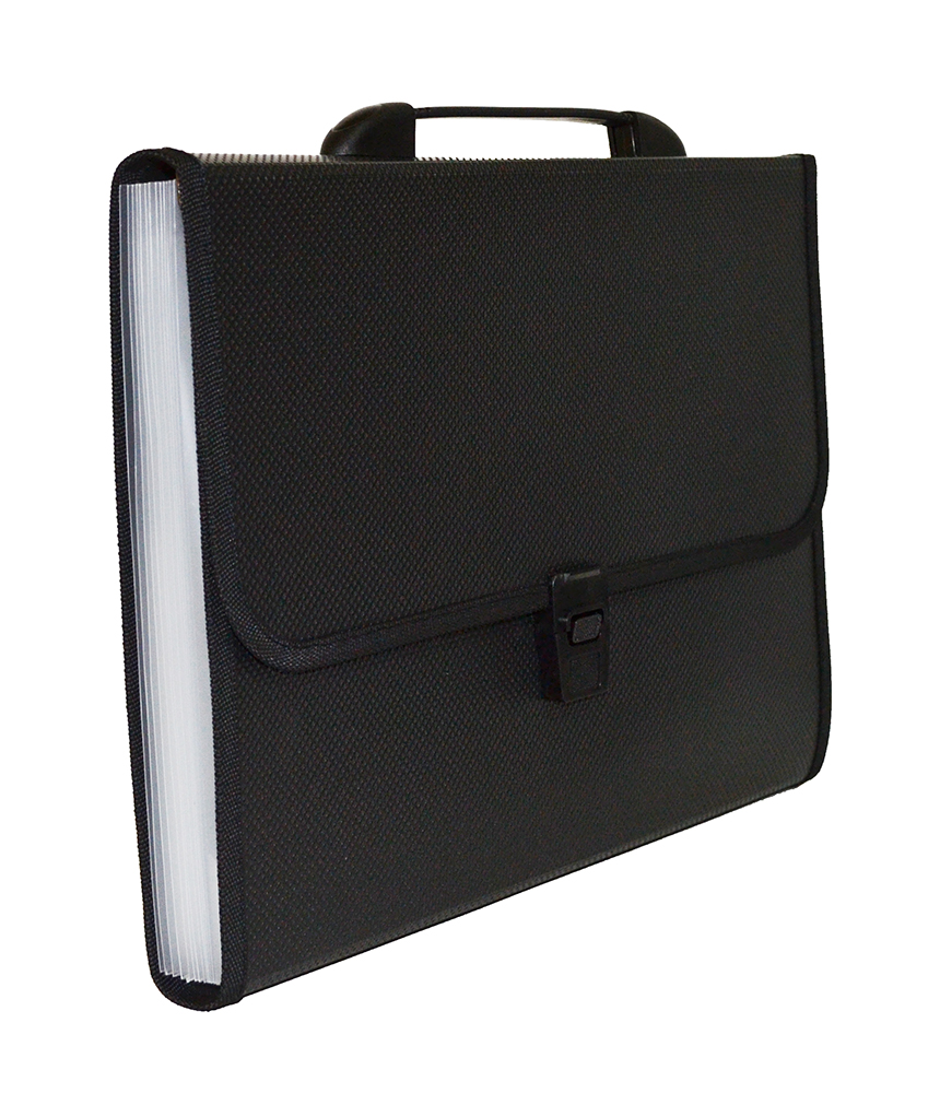 Портфель формата А4 из плотного непрозрачного рельефного пластика с тисемечной окантовкой с ручкой для хранения файлов и документов. В портфеле 13 полупрозрачных карманов с "язачками" для маркировки, в комплект входят наклейи с цифрами. Портфель плотно закрывается на замок. Удобен для переноски документов, предотвращает их смятие и загрязнение.
