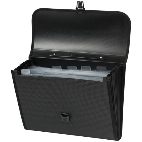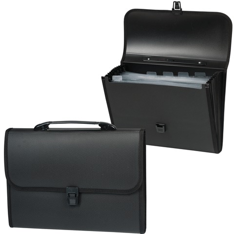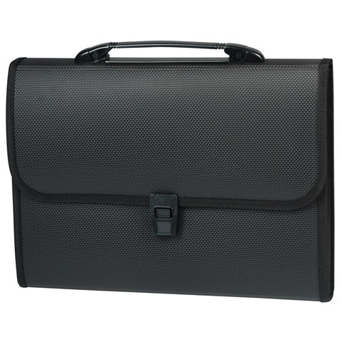 Портфель пластиковый с ручкой, для хранения и транспортировки документов формата А4, с шестью отделениями, с тканевой окантовкой и специальной текстурой.