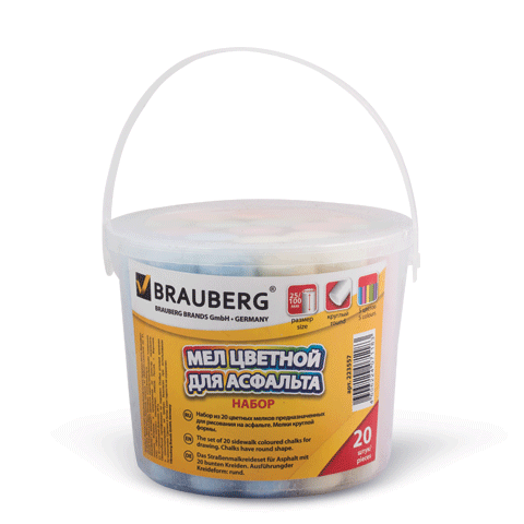 Мел цветной, набор 20 штук, круглый, асфальтовый BRAUBERG в ведерке