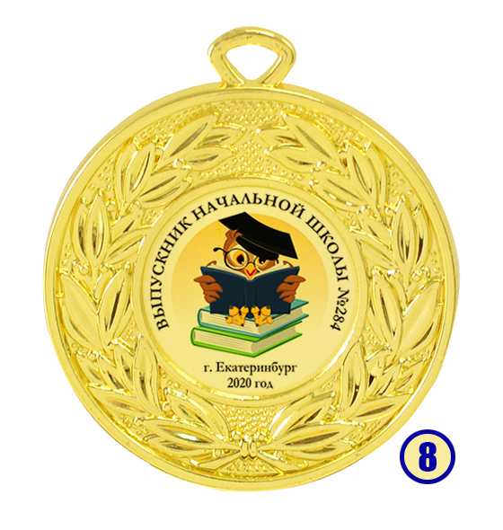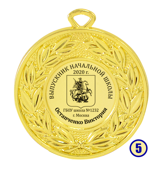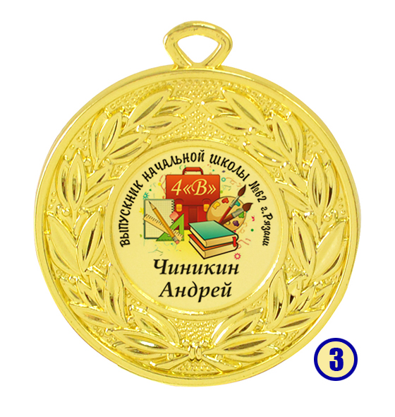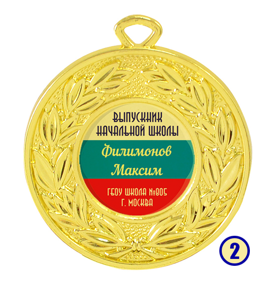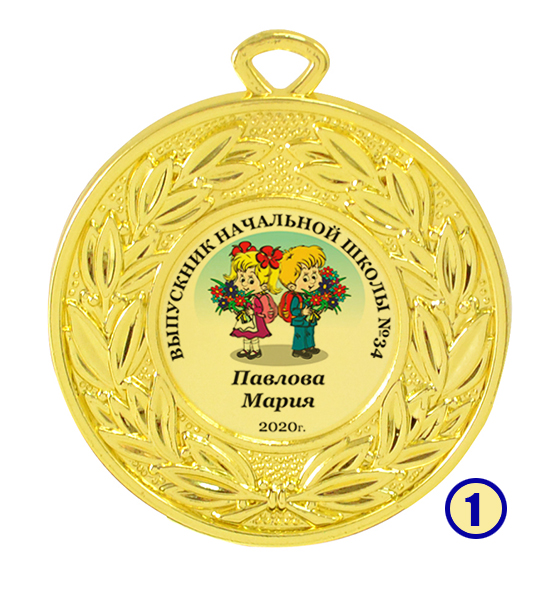 Именная медаль "Выпускник начальной школы" изготовлена из металла с золотым напылением, в центре - цветная гравировка на выбор.