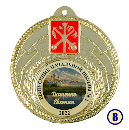 Именная медаль "Выпускник начальной школы" изготовлена из металла с золотым напылением, в центре - цветная гравировка на выбор.