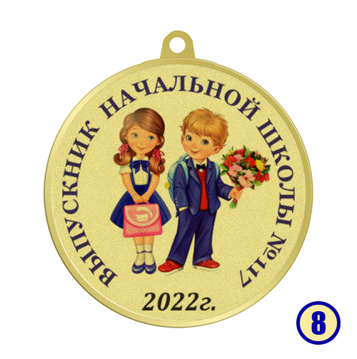 Медаль "Выпускник начальной школы" изготовлена из металла с золотым напылением, с объемной гравировкой на лицевой и на обратной стороне - цветная гравировка на выбор.