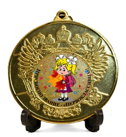 Медаль *Присвоено звание - ПЕРВОКЛАССНИЦА* изготовлена из металла с золотым напылением, в центре цветная гравировка с ярким рисунком.