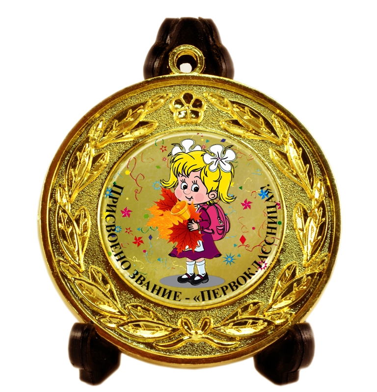 Медаль *Присвоено звание - ПЕРВОКЛАССНИЦА* изготовлена из металла с золотым напылением, в центре цветная гравировка с ярким рисунком.