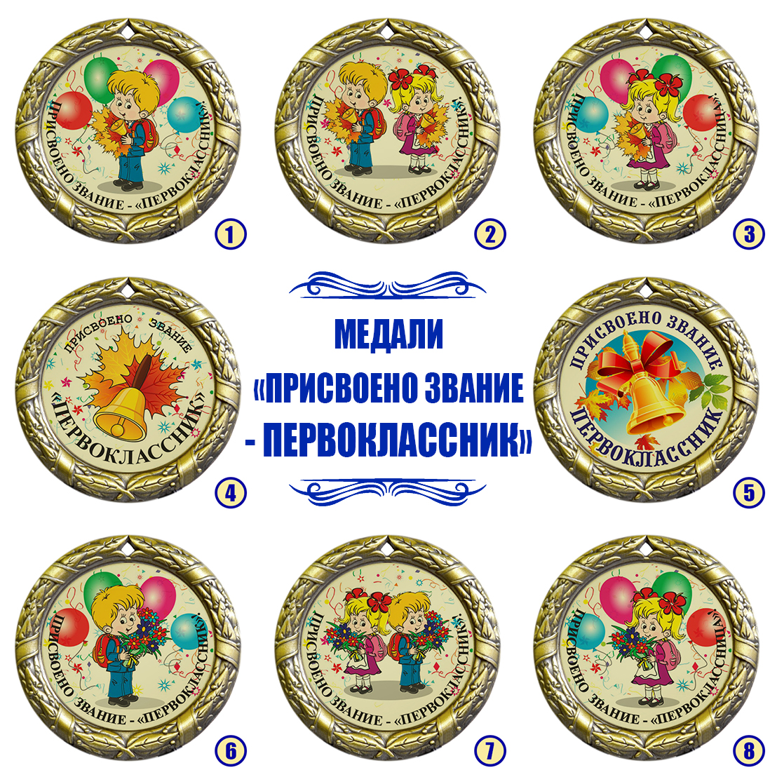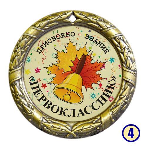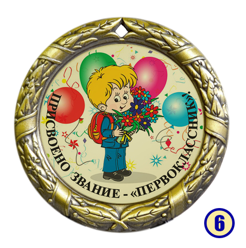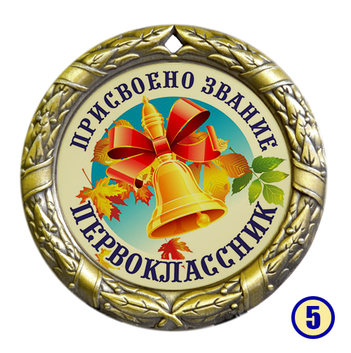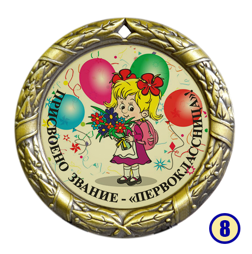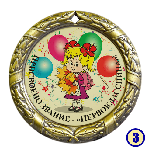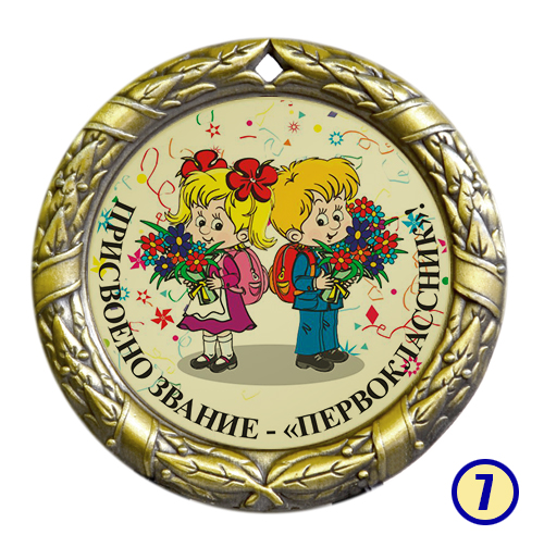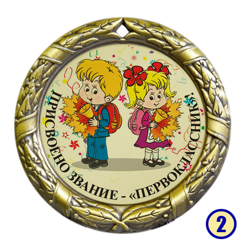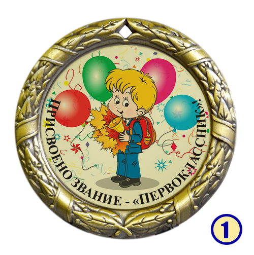 Медаль "Присвоено звание - первоклассник" изготовлена из металла с золотым напылением, в центре - цветная гравировка на выбор.
