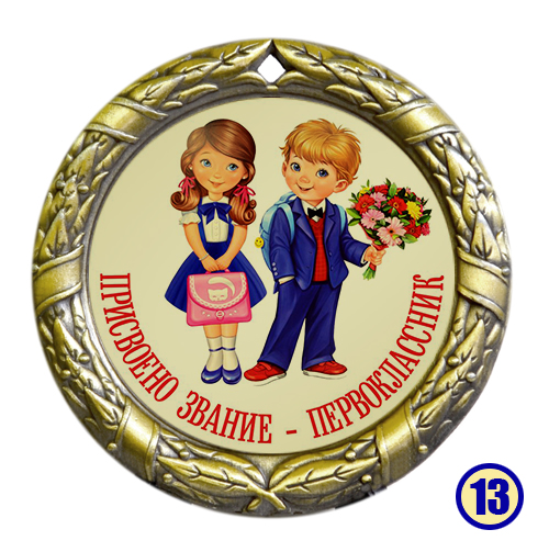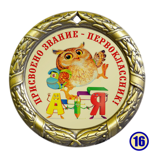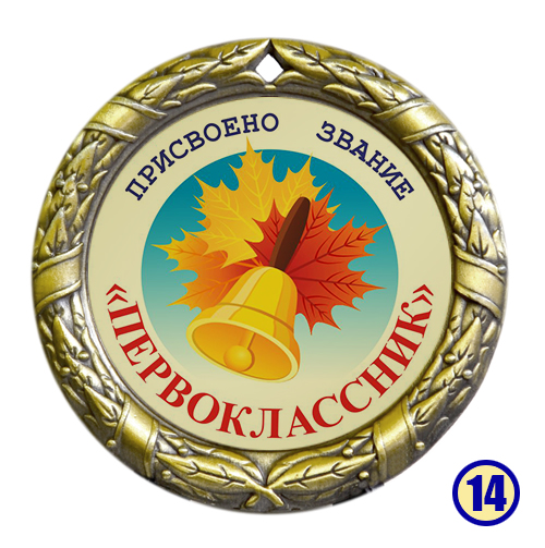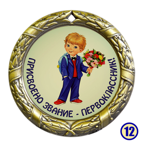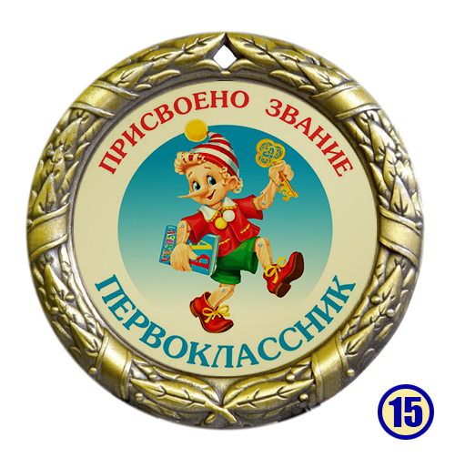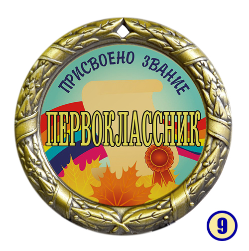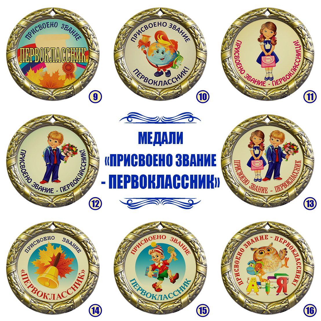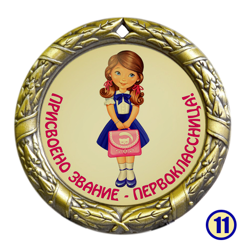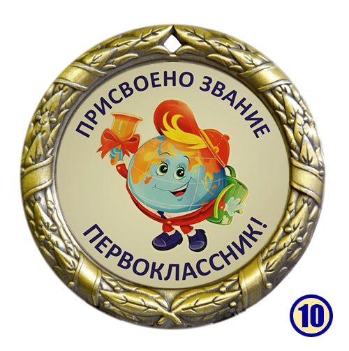 Медаль "Присвоено звание - первоклассник" изготовлена из металла с золотым напылением, в центре - цветная гравировка на выбор.