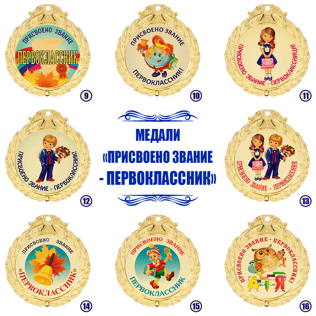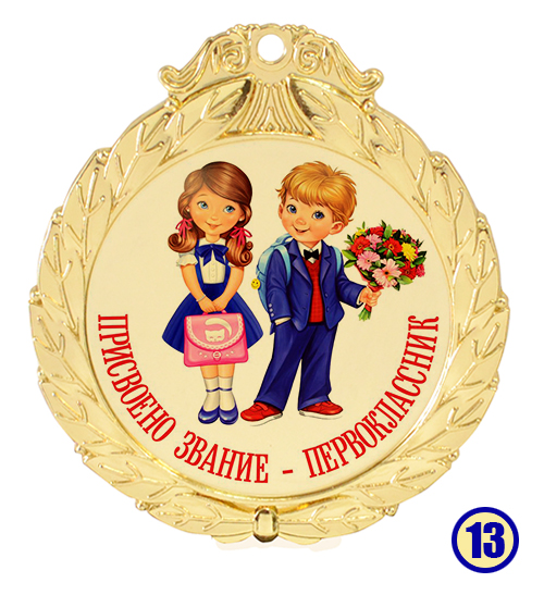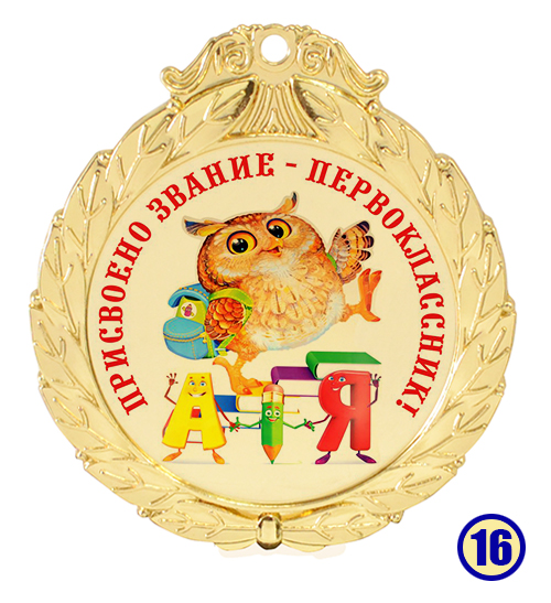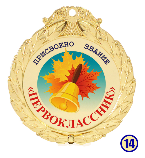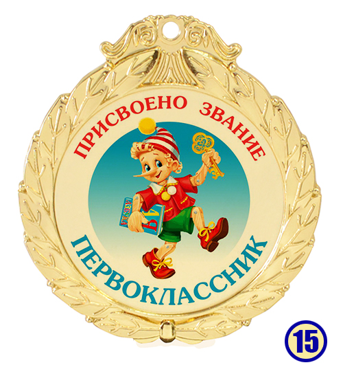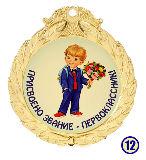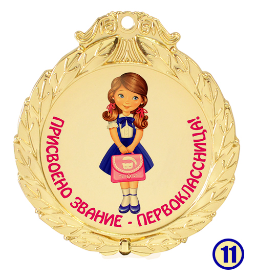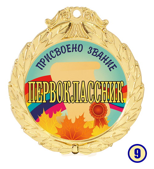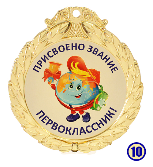 Медаль "Присвоено звание - первоклассник" изготовлена из металла с золотым напылением, в центре - цветная гравировка на выбор.