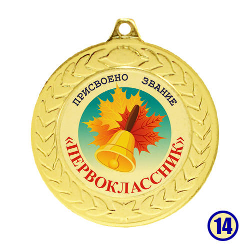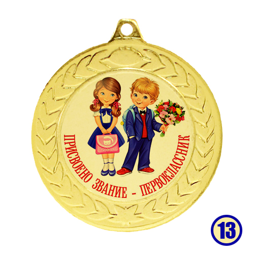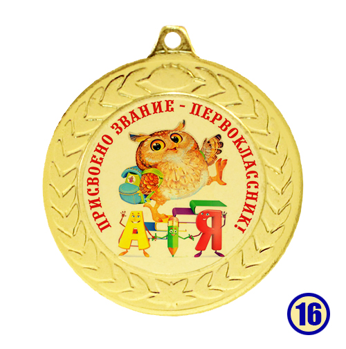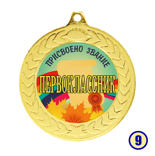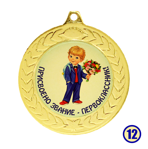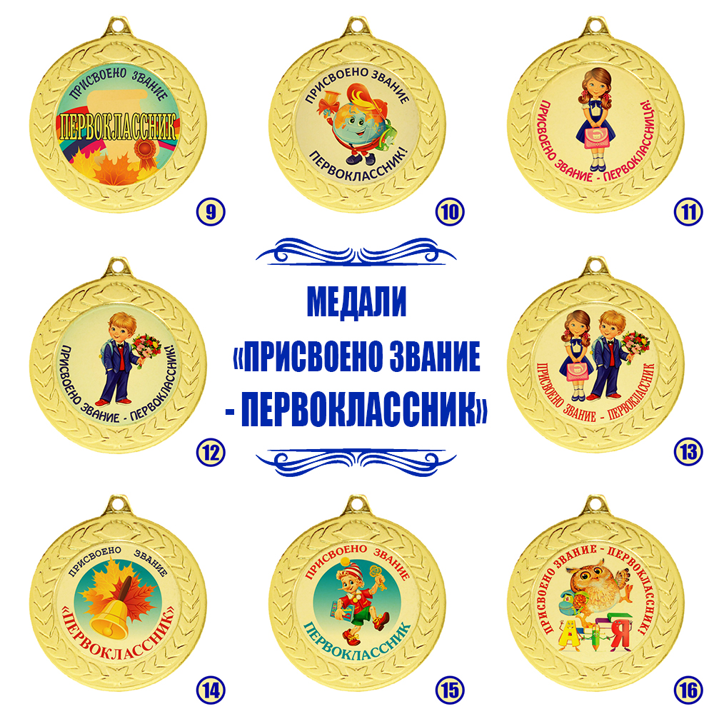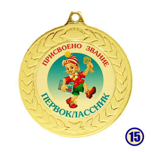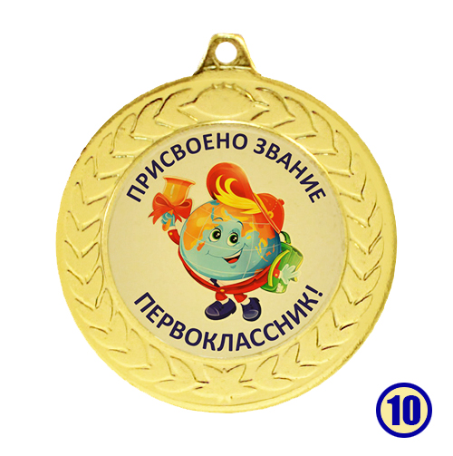 Медаль "Присвоено звание - первоклассник" изготовлена из металла с золотым напылением, в центре - цветная гравировка на выбор.
