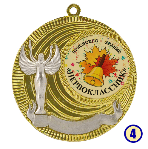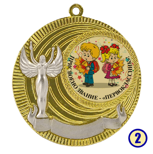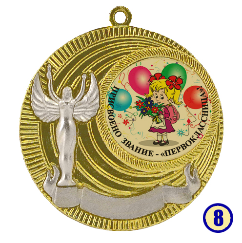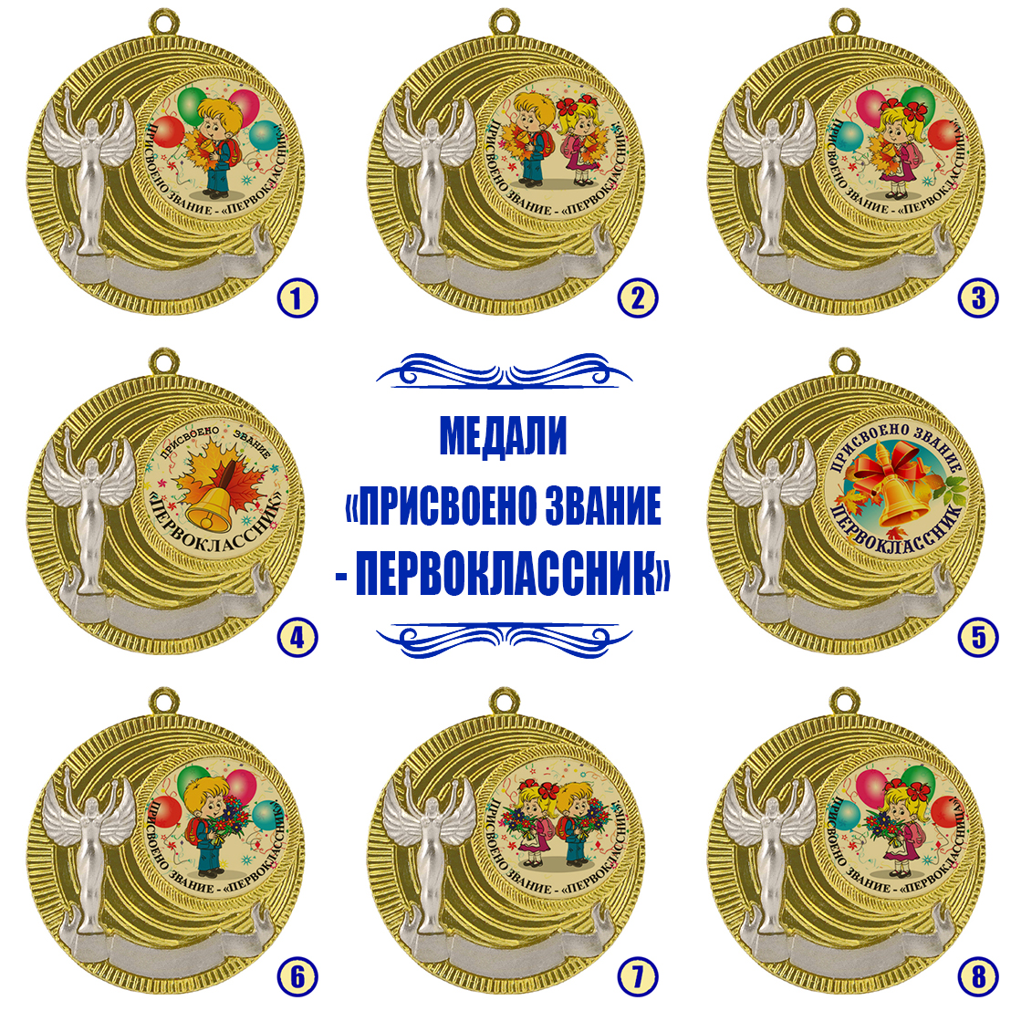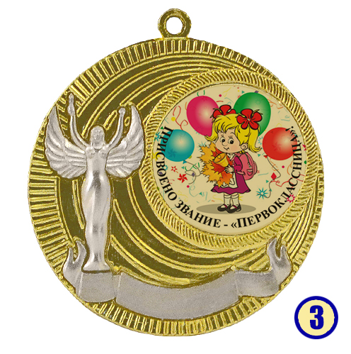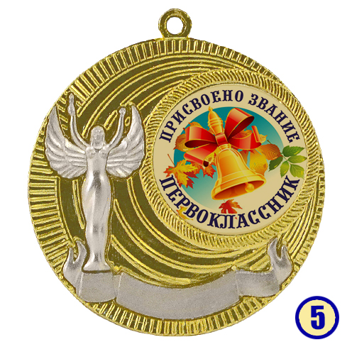 Медаль "Присвоено звание - первоклассник" изготовлена из металла с золотым напылением, в центре - цветная гравировка на выбор.