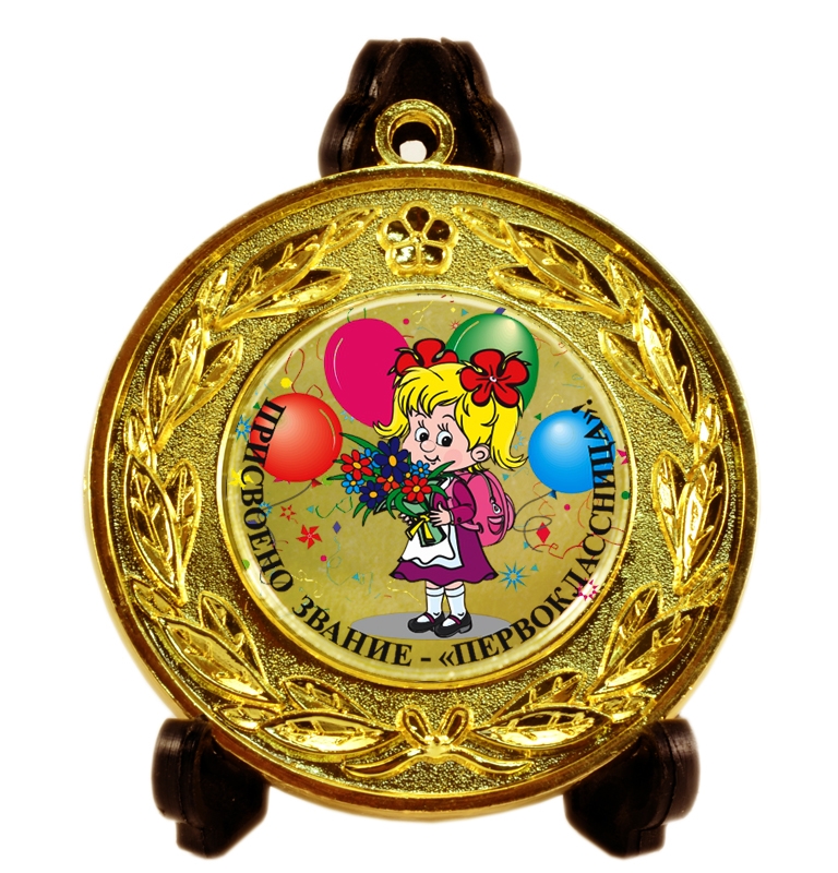 Медаль * Присвоено звание - ПЕРВОКЛАССНИЦА * изготовлена из металла с золотым напылением, в центре цветная гравировка с очаровательной девочкой.