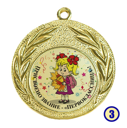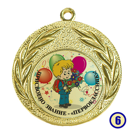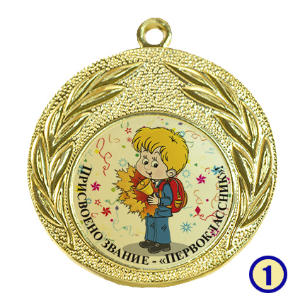 Медаль *Присвоено звание - ПЕРВОКЛАССНИК* изготовлена из металла с золотым напылением, в центре цветная гравировка с замечательным мальчиком.