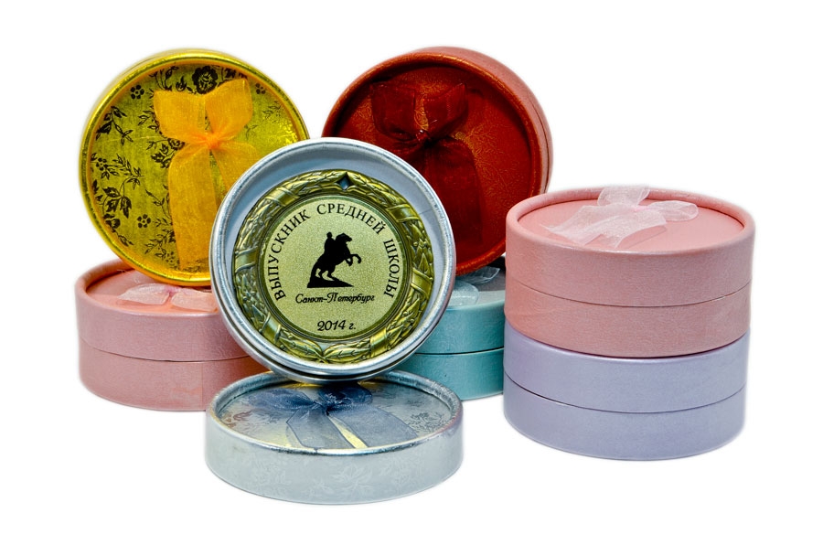 Коробки для подарков выполнены из плотного картона, что гарантирует сохранность медали. Внутри мягкая подложка.