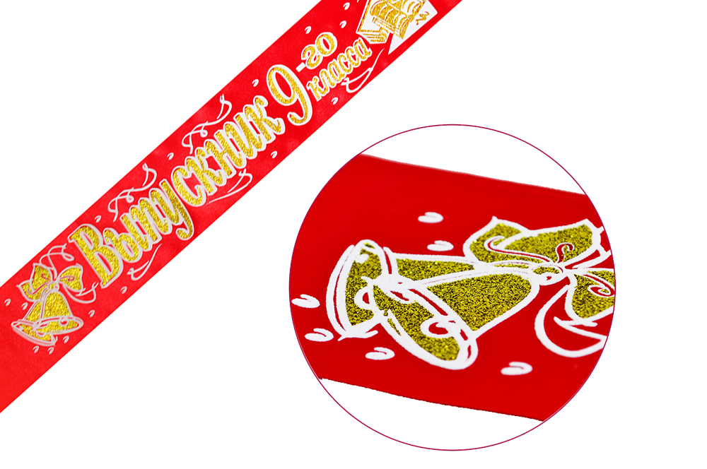 Лента произведена из атласа, ткань плотная, ложится в красивые складки при завязывании. Надпись сделана золотыми блестками и имеет белую обводку, что придает объем буквам.