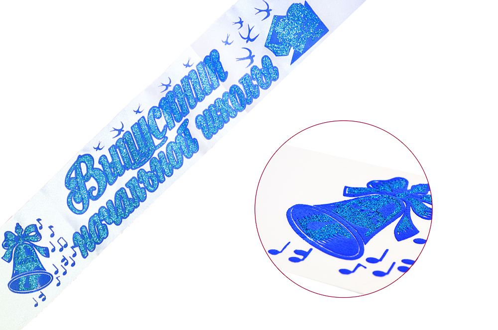 Лента произведена из атласа, ткань плотная, ложится в красивые складки при завязывании. Надпись сделана голубыми блестками и имеет синию обводку, что придает объем буквам.