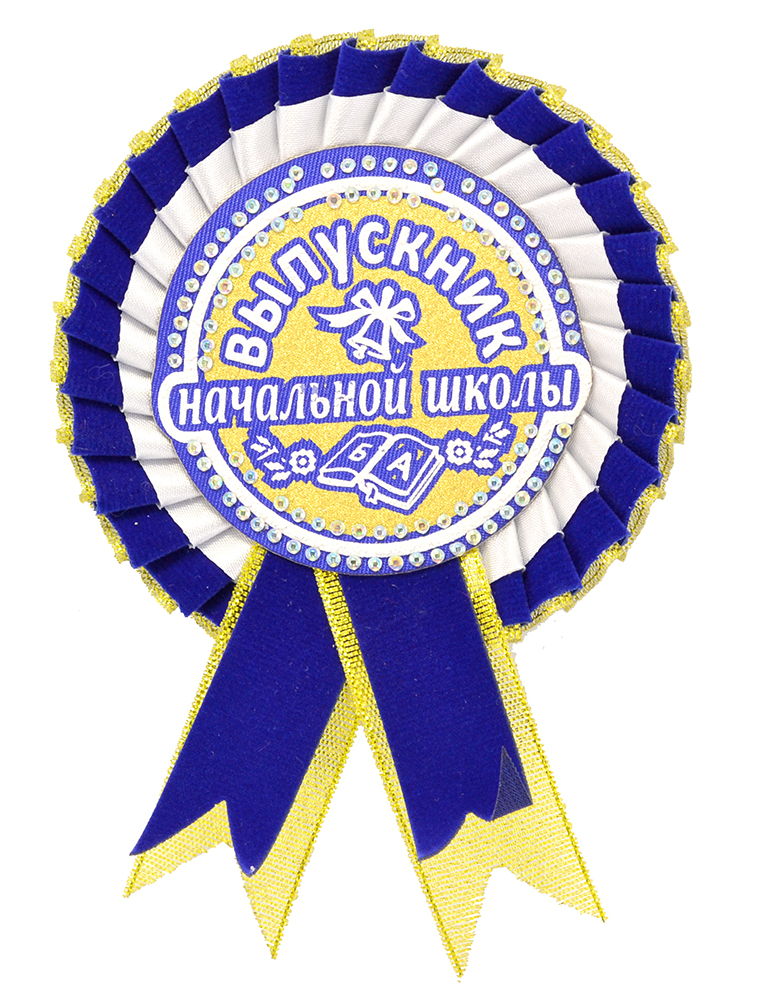 Значок-розетка со стразами "Выпускник начальной школы" объемные буквы, парча, бархат синий ободок парча