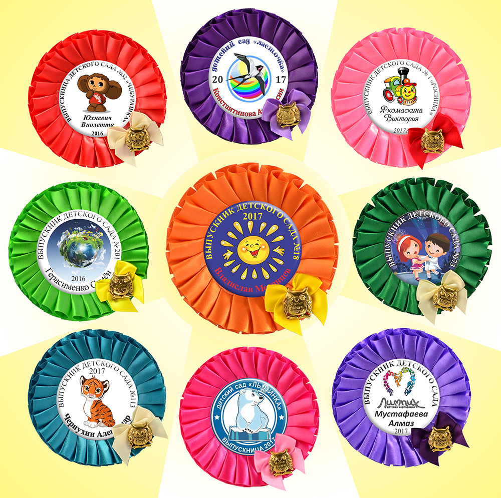 Одноярусная розетка цвета ленты в ассортименте, металлическая серединка с яркой картинкой. Украшена пуговкой в виде совы и бантико На обороте булавка с удобным креплением. Замечательный памятный подарок на окончание детского сада.