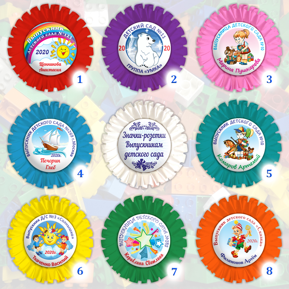 Значок-розетка изготовлен из атласной ленты, серединка - из металла и прочного пластика с яркой картинкой.