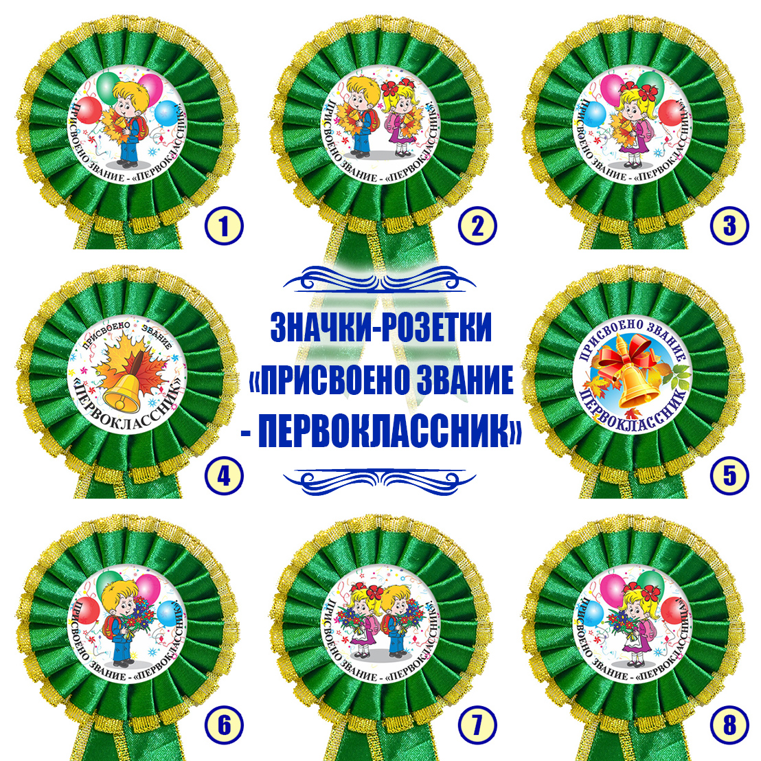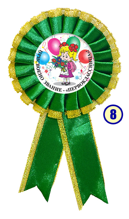 Значок-розетка из атласной ленты "Присвоено звание Первоклассник"
