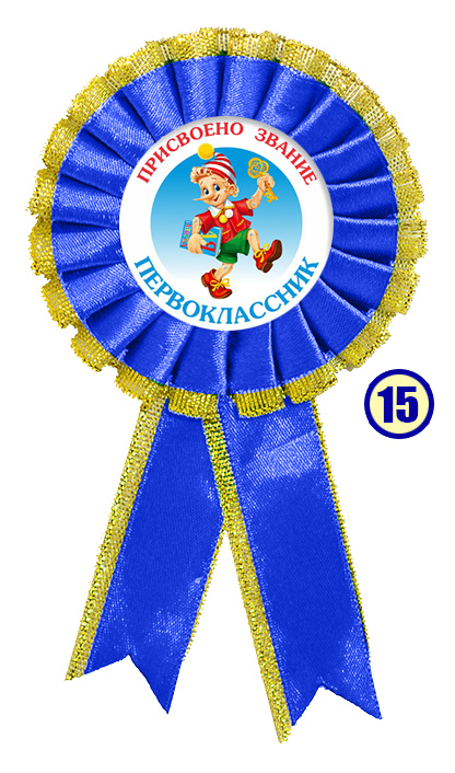 Значок-розетка из атласной ленты "Присвоено звание Первоклассник"