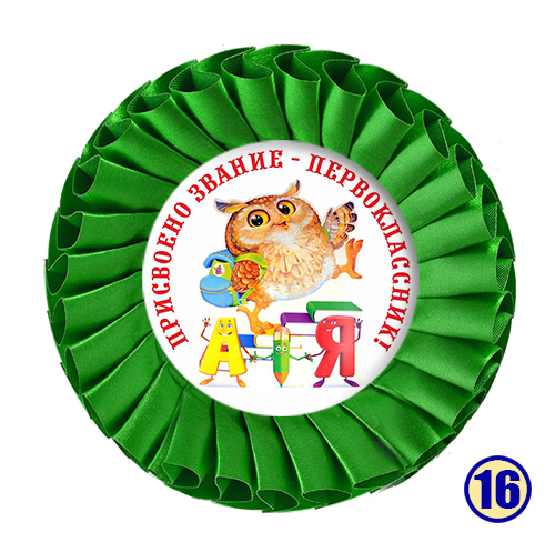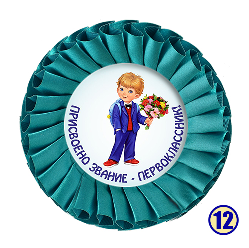 Значок-розетка изготовлен из атласной ленты, серединка - из металла и прочного пластика с яркой картинкой.
