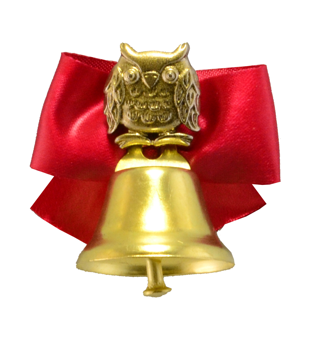 Металлический позолоченный колокольчик с язычком, красной атласной лентой и совой, крепится при помощи прочной булавки.