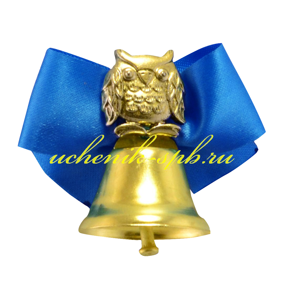 Металлический позолоченный колокольчик с язычком, синей атласной лентой и совой, крепится при помощи прочной булавки.