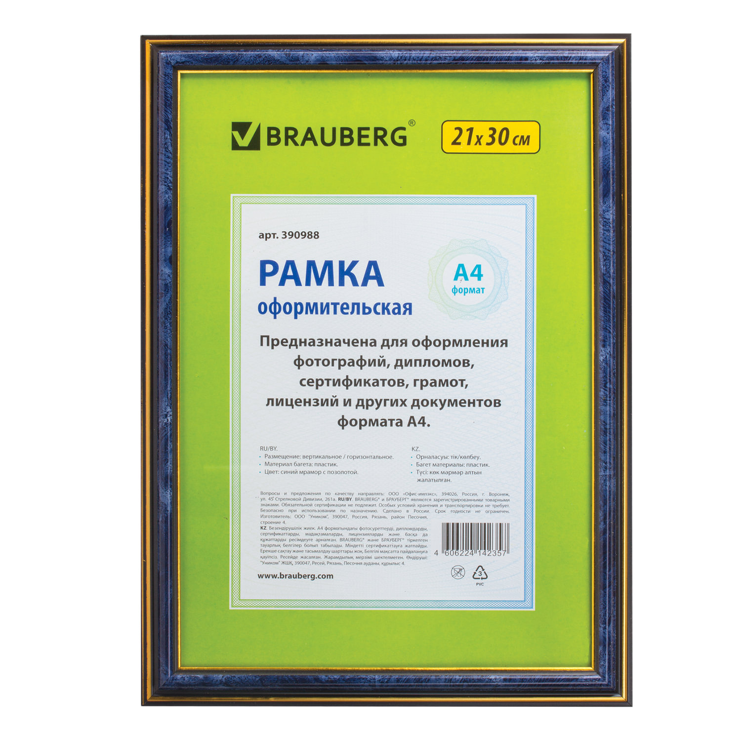 Рамка 21*30 см, пластик, багет 20 мм, BRAUBERG "HIT3", синий мрамор с двойной позолотой, стекло, 390988