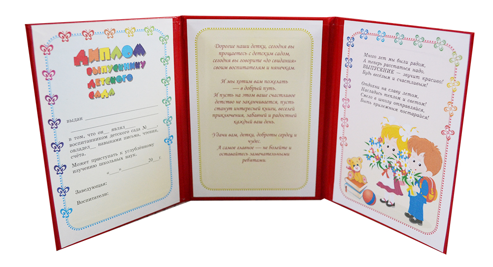 Памятный диплом красного цвета "Выпускник детского сада" 3 створки (мальчик и девочка)