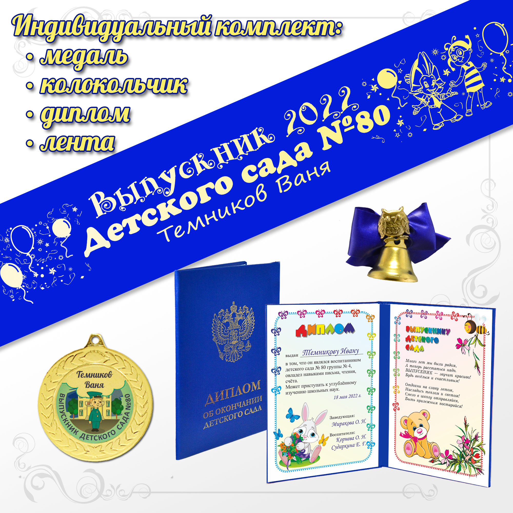 • В наборе: именной диплом, именная атласная лента, колокольчик, медаль с гравировкой, лента для медали, коробочка под медаль