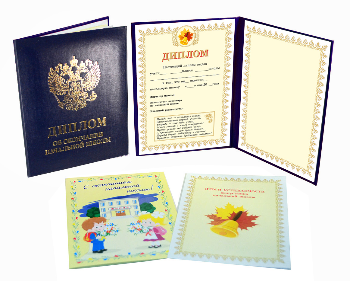 Памятный диплом об окончании начальной школы синего цвета в комплекте с бланком "Итоги успеваемости (колокольчик)" и открыткой