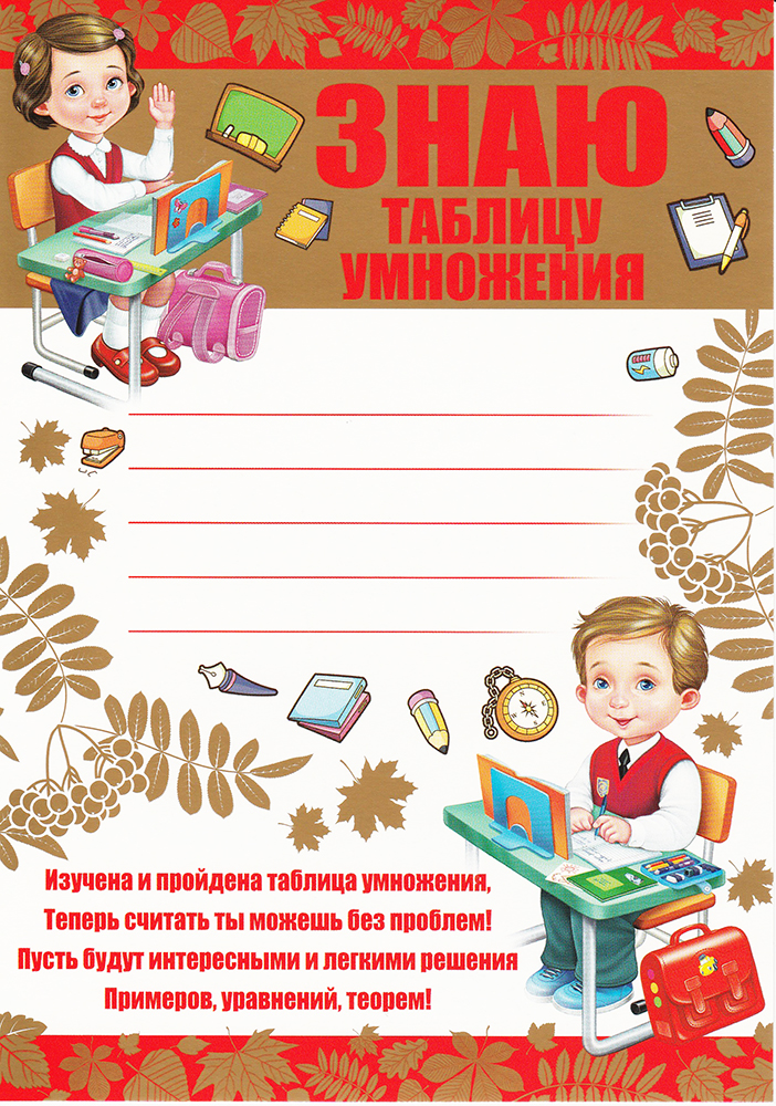 Грамота А5, 10 штук в упаковке "Знаю таблицу умножения", пантон бронза 01.806.00