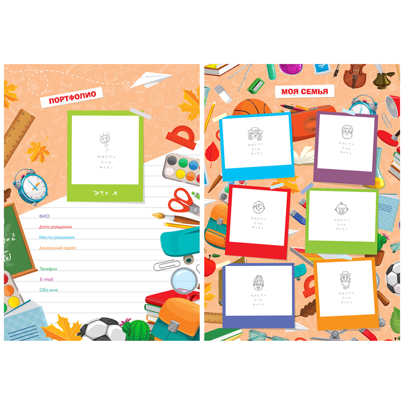 Папка-портфолио ArtSpace для школьника формата А4 на кольцах станет надёжным помощником для учащегося. Папка размером 245*320 мм изготовлена из твёрдого картона с глянцевой ламинацией и ярким весёлым рисунком. На 4 металлических кольцах держатся 20 файлов плотностью 60 мкм. В нем можно хранить всевозможные грамоты, дипломы, фотографии и другие достижения школьника. Также в комплект входят вкладыши из плотной мелованной бумаги с разделами: "Это я", "Моя семья", "Мои друзья", "Мой город", "Моя школа", "Мой класс", "Мои оценки", "Мое творчество", "Мои достижения" и "Отзывы и пожелания".