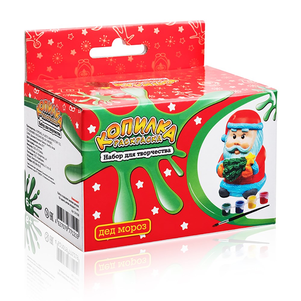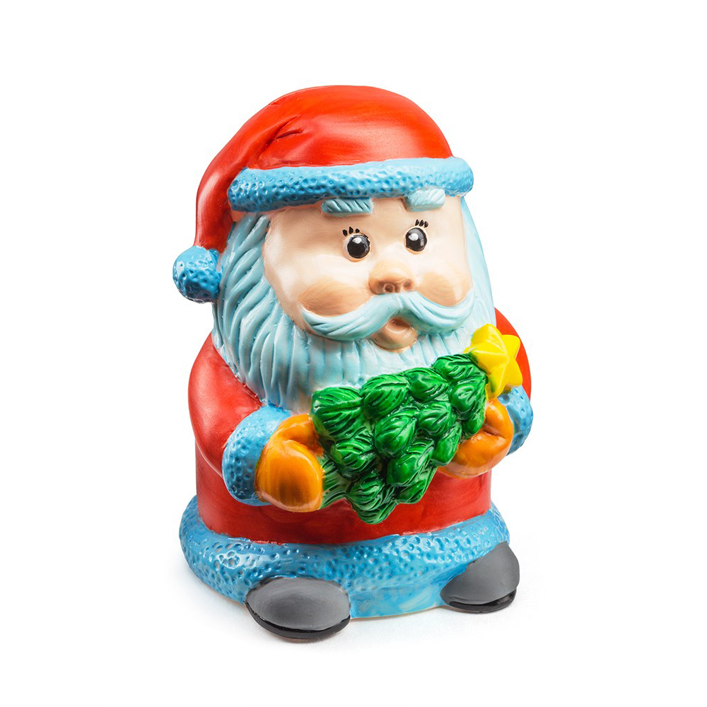 Дед мороз держит в руках новогоднюю елочку со звездой. Ноаогодняя копилка - замечательный сувенир к празднику. Набор для творчества - копилка, краски и кисточка в красочной коробке с европодвесом.