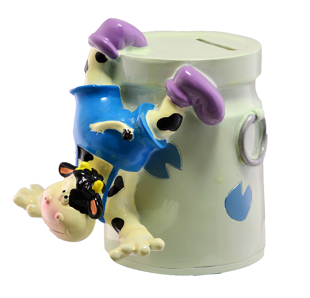 Полая керамическая емкость для хранения монет или бон. На внешней стороне фигура теленка вверх ногами, зацепившегося за верх копилки. С двух сторон нанесен выпуклый рисунок, имитирующий металлические кольца.