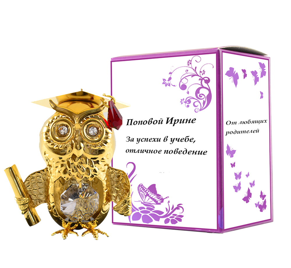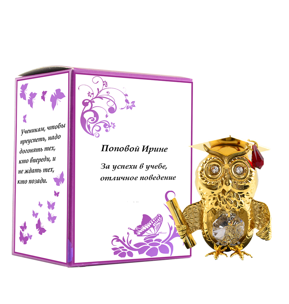 Красивая статуэтка из металла в виде совы инкрустирована эксклюзивными кристаллами Swarovski. Станет отличным подарком для педагогов или выпускников детских садов и школ, легко украсит любой интерьер домашнего очага или рабочего места, а памятная надпись на подарочной коробке сделает этот подарок особенным и запоминающимся!