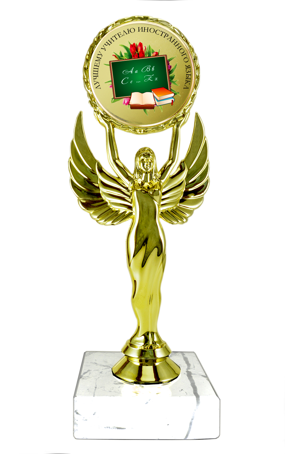 Статуэтка Ника с эмблемоносителем на мраморном камне "Лучшему учителю иностранного языка"