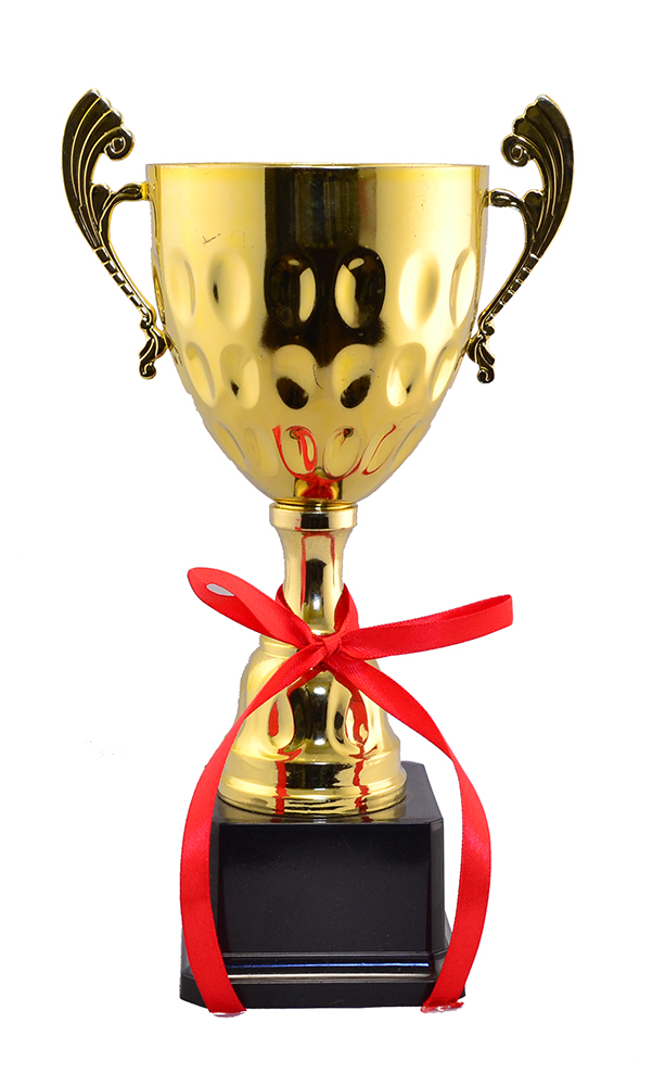 Чаша из желтого металла, покрыт золотым напылением. Ножка и постамент выполнены из высококачественного прочного пластика с золотым напылением. На ножке также завязана атласная ленточка.